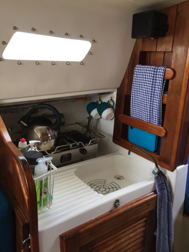 Galley space to port forward of settee berth (maxie was standard factory stove)