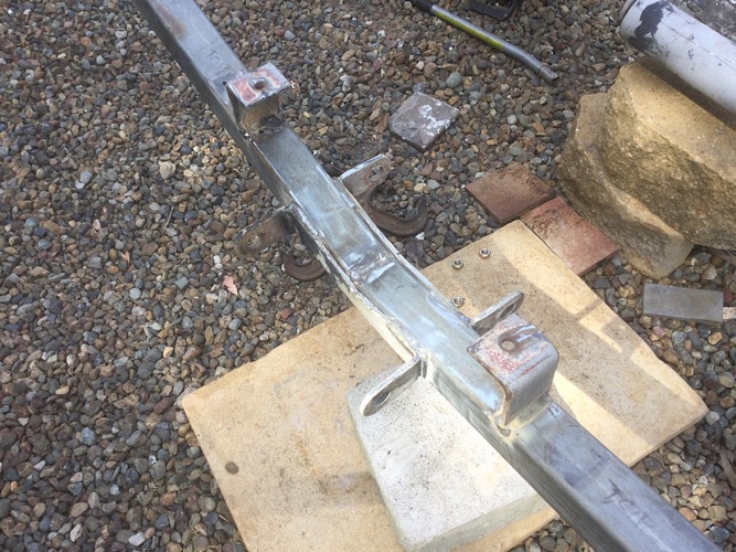 In constructing a complete new rear cross beam I originally tried making a template of the correct angle to cut the 50mm square section at each end. This was a mistake as even a few degrees differences in template angle was amplified after cutting and setting up the centre join. Ultimately I made a jig of sorts by marking out distances on tape stuck on the garage floor using the original rusty beam as a guide and then marking out upright cuts perpendicular to the floor with a large metal square. All good with neat tight joints to weld.see pic.All I did was tack the bits together with my arc welder till my mate could do the final proper job. Bunk brackets were reused after removal and cleanup. Why reinvent the wheel.