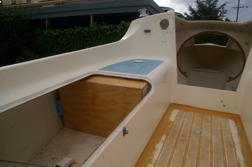 Port side cockpit showing box insert to extend inner berth length beyond 6 feet.