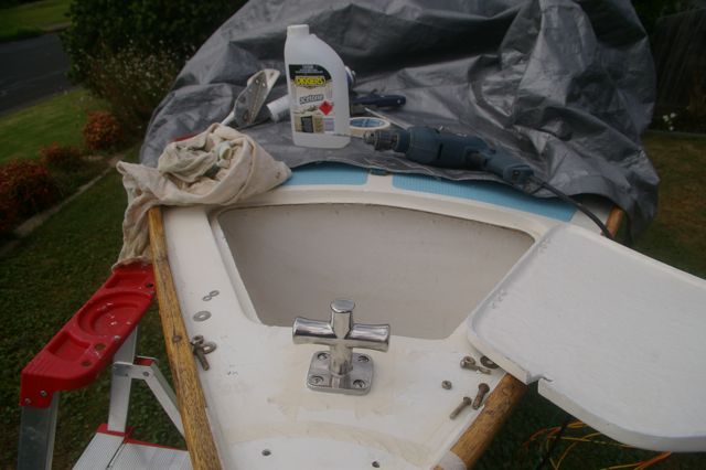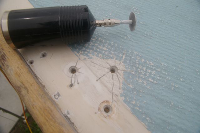 The holes are now waiting to be re-drilled, and the deck fittings reinstalled into clean, unfractured holes, with new white silicon sealant.