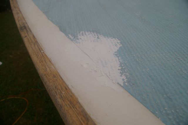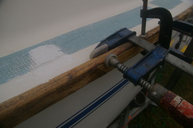 I've also scrapped off the enamel paint on the wooden gunwale strips, and sanded and filled these again ready for painting with clear marine varnish. If I had more money and energy, I'd replace both strips with new strips - but for the time being I'm just fixing up what's there: cutting out rot and backfilling with plastic wood compounds, etc. There are some great products on the market now for such work, and nothing beats the look of real wood somewhere on a boat's exterior.