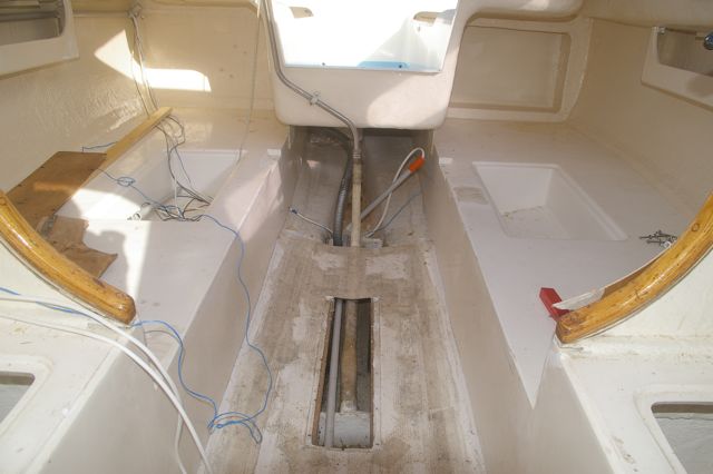 Stripped interior of QUMBU, awaiting new wiring. Note port side berth extension (for skippers like me who are over 6 ft long!)
