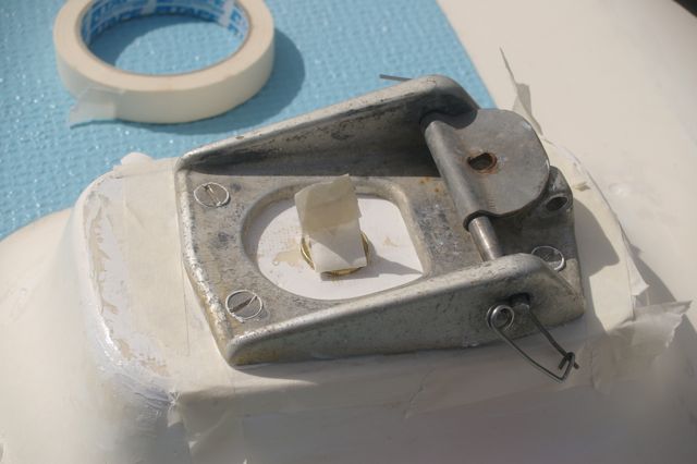Foredeck area showing masking taped areas around chainplate attachment and new SS anchor rope bollard