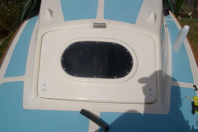 In an earlier post I talked about how I had cut an oval hole in the front cabin hatch of my boat, then cut and screwed in a new piece of tinted plexiglas to create a new hatch window.